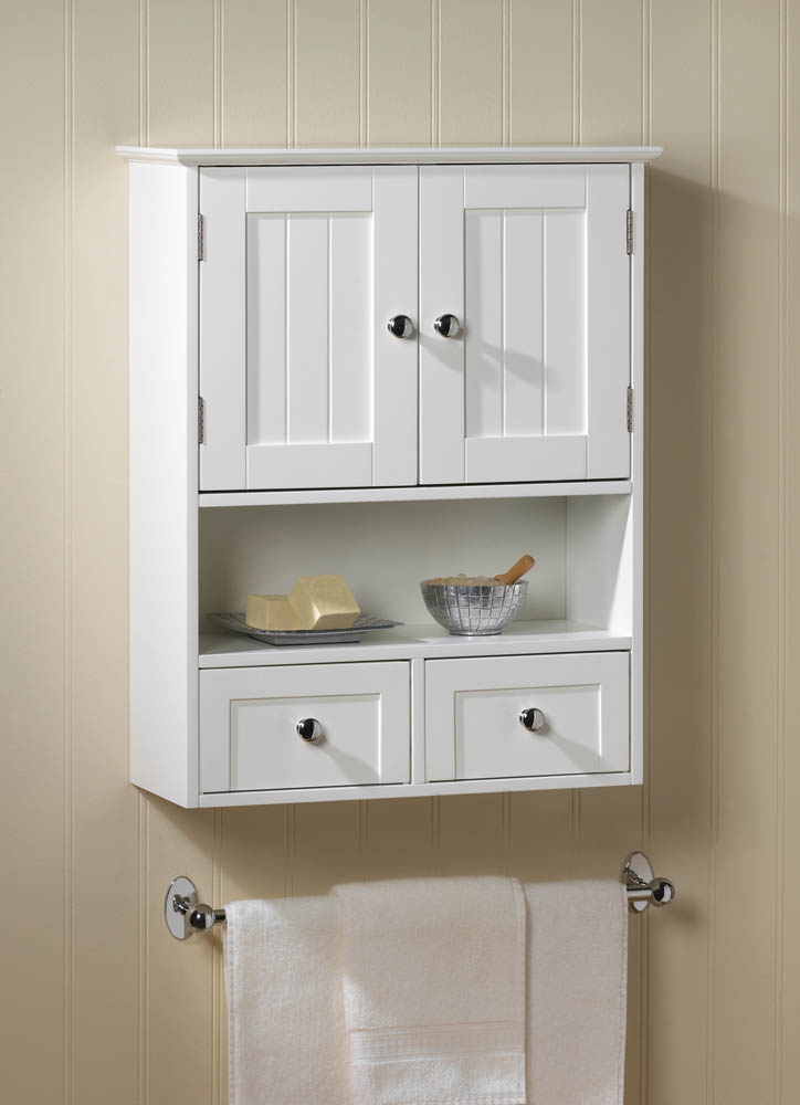 • Charm and practicality come together in perfect harmony with this wall cabinet. It adds storage to any space with its two Nantucket-style doors and two pullout drawers, along with its open display shelf. It's perfect for the bathroom and beyond!