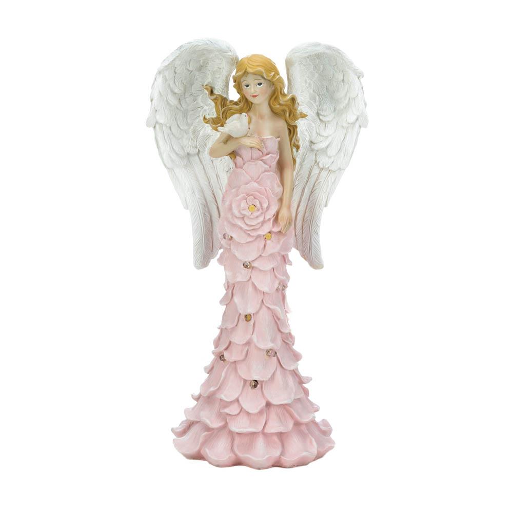 • Add a calming presence to your outdoor space with this charming angel garden statue. This beautiful garden angel features a solar powered design that illuminates the pink rose dress and the bird at night.