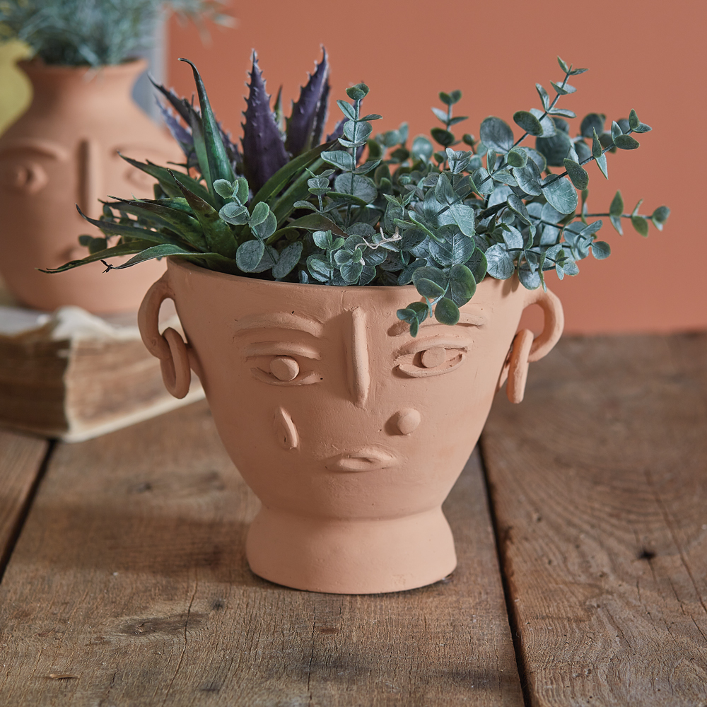 This unique and captivating planter is not just a vessel for your plants, but a masterpiece that adds a touch of innovative elegance to any space. Handcrafted by skilled artisans, its intricate yet abstract facial features evoke a sense of creativity, making it a conversation piece. This terra cotta planter is handmade. Differences in shade and shape are to be expected.
