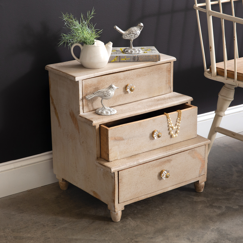 Creative, yet delicate this stairstep display will bring a feminine touch wherever you display it. Store your precious gems inside to use as a jewelry box. This item is fashioned from mango wood and features crystal-like knobs.