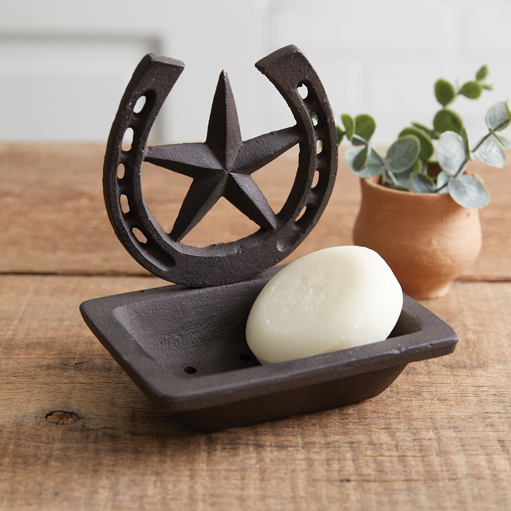 Wash up from a long day of riding horses with this western soap dish. Display in your bathroom or kitchen to accent any western cabin or country home. A star and horseshoe adorns the top of the dish. Item is made of cast iron and features drain holes for ease of cleaning.