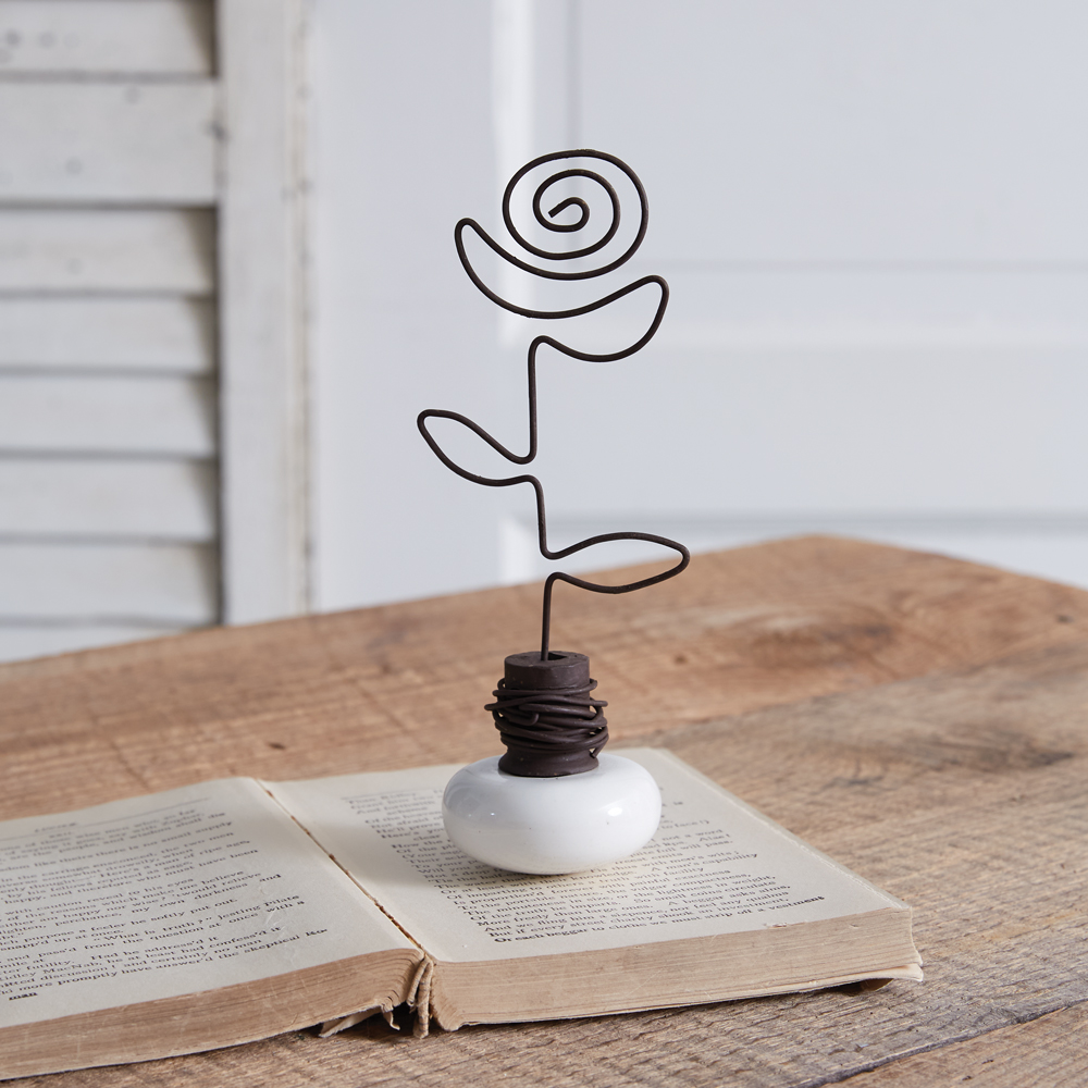 Our doorknob photo holders are a unique way to display your favorite photo and vintage style. Detailed with a wire rose, this photo holder will compliment a table with elegance.